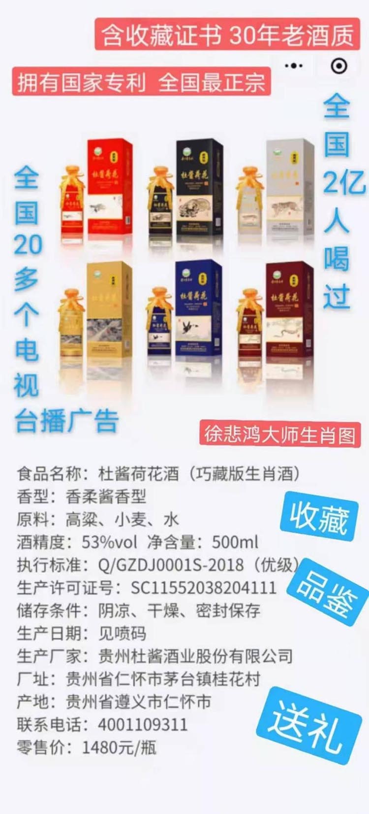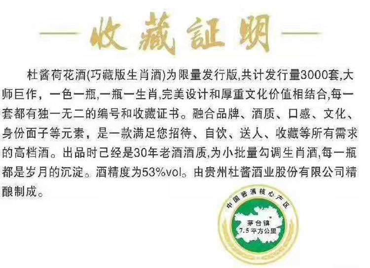杜酱荷花酒(巧藏版生肖酒)系贵州杜酱酒业股份有限公司投入大量精力、资金、聘请国家食品级专家酿酒师、品酒师、调酒师进行科研始创:香柔酱香型白酒--报经国家食药局相关部门批准执行标准Q/GZDJ0001S贵州杜酱酒业股份有限公司主要注重酒体的醇香、柔和,特创立香柔酱香好入口这一特点、致力于打造:香柔酱香型白酒领导品牌并为此而奋斗终身
